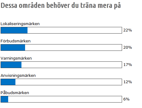 Nu har vi en ny funktion som är en komplement till statistiken på ett sett som gör att du hela tiden har koll på vilka moment du måste träna mera på. Detta kan även ses som ett underlag för din körskolelärare som kan lägga ut körpasset efter underlaget. På så sätt blir din körlektion så effektiv som möjligt.