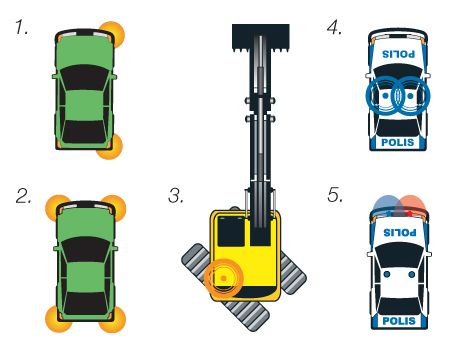 På utryckningsfordon används en larmanordning som består av ljudsignal och blått blinkande eller roterande ljus. Du ska lämna fri väg när ett utryckningsfordon ger signal med larmanordning! |